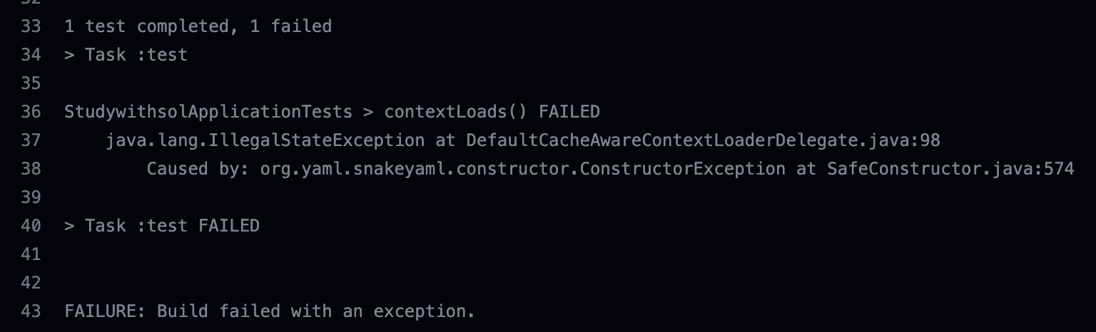 ERROR StudywithsolApplicationTests > contextLoads() FAILED 37 java.lang.IllegalStateException at DefaultCacheAwareContextLoaderDelegate.java:98 38 Caused by: org.yaml.snakeyaml.constructor.ConstructorException at SafeConstructor.java:574 해결 -> 3번으로 해결 1. @SpringBootTest어노테이션에 class 추가 @SpringBootTest(classes = StudywithsolApplicationTests.class) class StudywithsolApplicationTests { @Test void co..