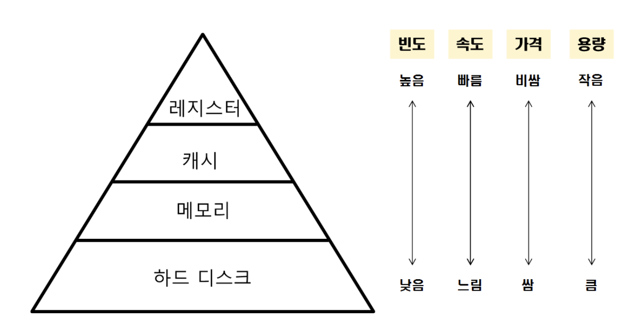 3.2 메모리 CPU는 그저 '메모리'에 올라와 있는 프로그램의 명령어들을 실행할 뿐이다. 메모리 계층과 메모리 관리를 알아보자. 3.2.1 메모리 계층 메모리 계층은 레지스터, 캐시, 메모리, 저장장치로 구성되어 있다. 레지스터 : CPU안에 있는 작은 메모리, 휘발성, 속도 가장 빠름, 기억 용량이 가장 적다. 캐시 : L1, L2 캐시를 지칭한다. 휘발성, 속도 빠름, 기억 용량이 적다. 참고로 L3 캐시도 있다. 주기억장치 : RAM을 가리킨다. 휘발성, 속도 보통, 기억용량이 보통이다. 보조기억장치 : HDD, SSD를 일컬으며 비휘발성, 속도 낮음, 기억 용량이 많다. 램은 하드디스크로부터 일정량의 데이터를 복사해서 임시 저장하고 이를 필요 시마다 CPU에 빠르게 전달하는 역할을 한다. 계층 ..