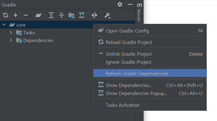 Gradle -> 해당 프로젝트에서 오른쪽 클릭 -> Refresh Gradle Dependencies 클릭